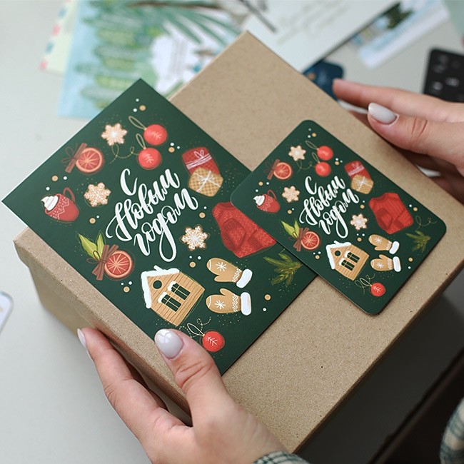 Так появилась одна из открыток нашей зимней коллекции — с надписью «С Новым годом» и особым, узнаваемым настроением. Чтобы погрузиться в атмосферу, я заварила душистый чай с корицей и апельсином, укрылась любимым пледом и включила рождественский джаз. Маленькие ритуалы помогают настроиться на нужную волну — даже летом. Цвет фона я выбрала тёмно-зелёный, как еловые ветки. Он сразу задаёт ощущение праздника, как запах свежей хвои, принесённой в дом. На этом фоне появились детали: варежки, пряники, домик, кружка, новогодние игрушки. Всё сложилось чуть небрежно — будто оставлено на столе в предновогодней суете, когда в доме кипит жизнь, кто-то готовит, кто-то упаковывает подарки, а кто-то просто мечтает о снежной прогулке. В декабре всё слегка перемешано — как и должно быть в праздники. |