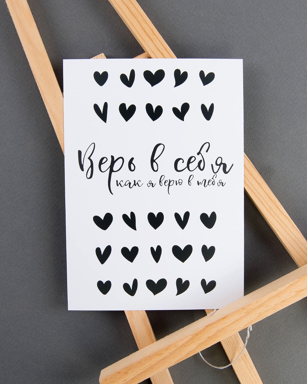 Стильная открытка «Верь в себя» сочетает минималистичный монохром и динамику форм в иллюстрации. Несмотря на цветовое решение, ее невозможно назвать скучной: центральную часть занимает рукописное послание, обрамленное сверху и снизу выстроившимися в ряды сердцами. Каждое сердце имеет индивидуальную форму, как если бы даритель рисовал их собственноручно. Это придает иллюстрации живости, цепляет внимание и оставляет приятные ощущения.