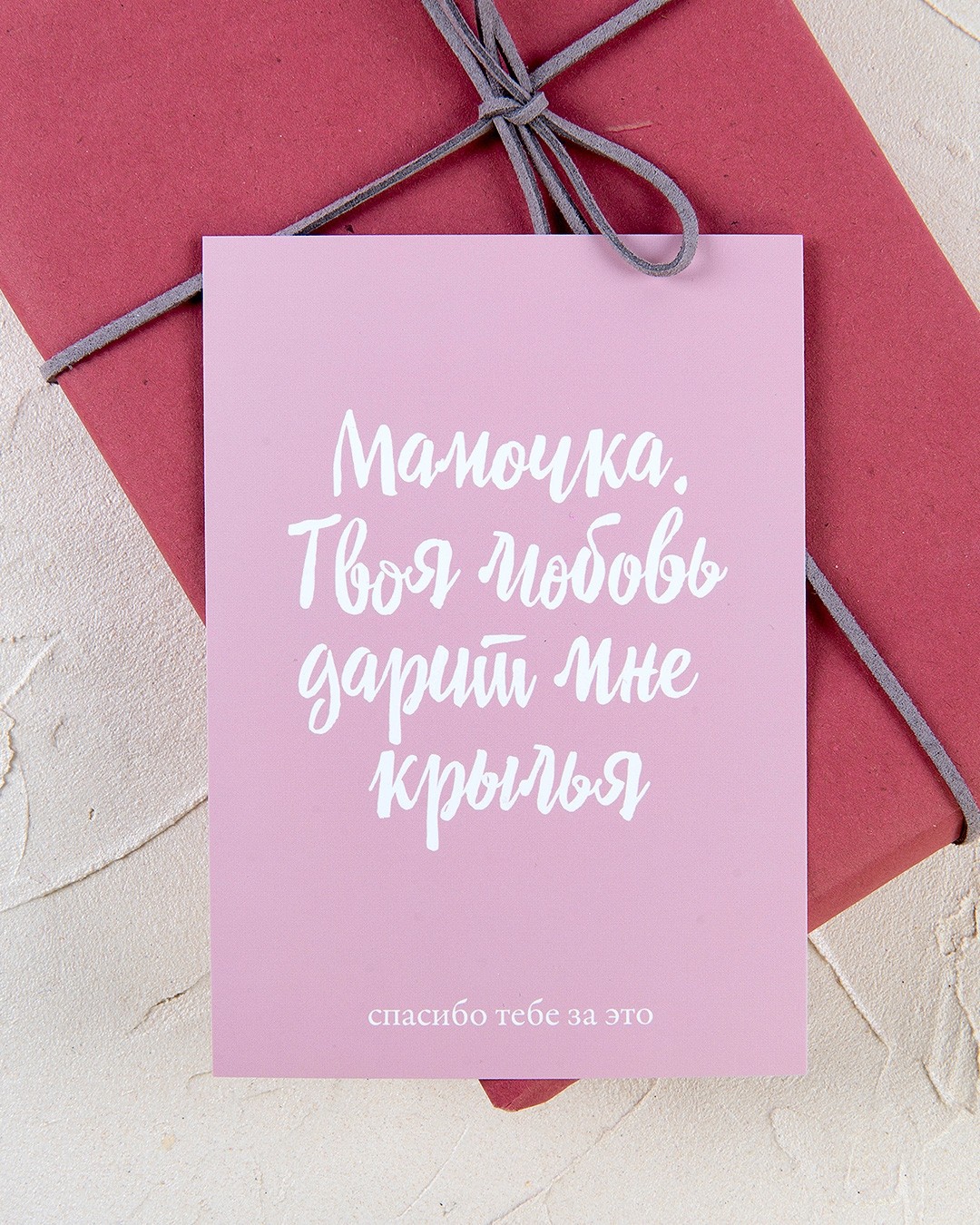 Нежная и воздушная открытка «Мамочка, твоя любовь дарит мне крылья» похожа на румяные щечки или самое нежное платье из розового сатина. Сочетание приглушенного розового и белого цветов с каллиграфическим шрифтом вызывает ассоциации с легкостью, девичеством, поцелуями в щеку и первыми крыльями, подаренными мамой – из проволочного каркаса и тюлевой занавески.
