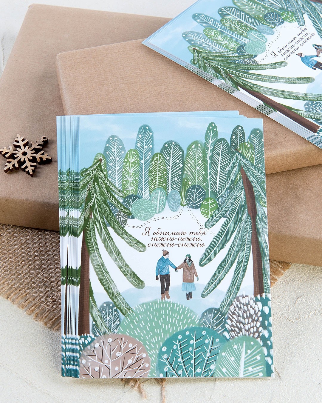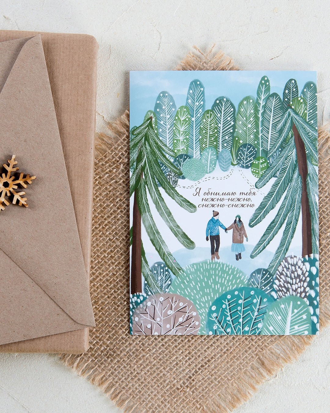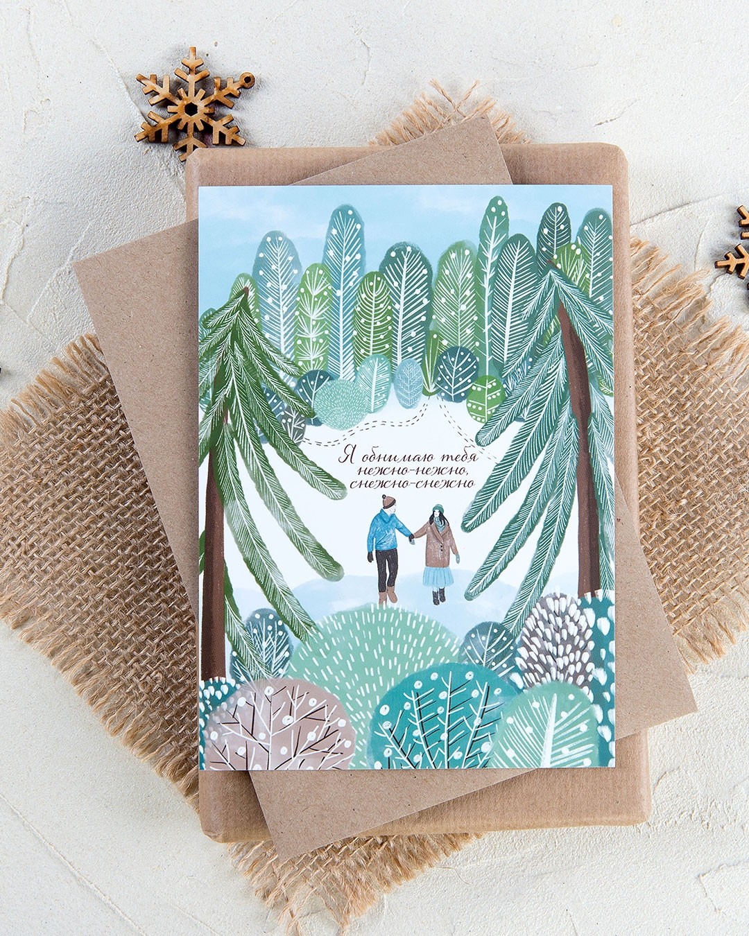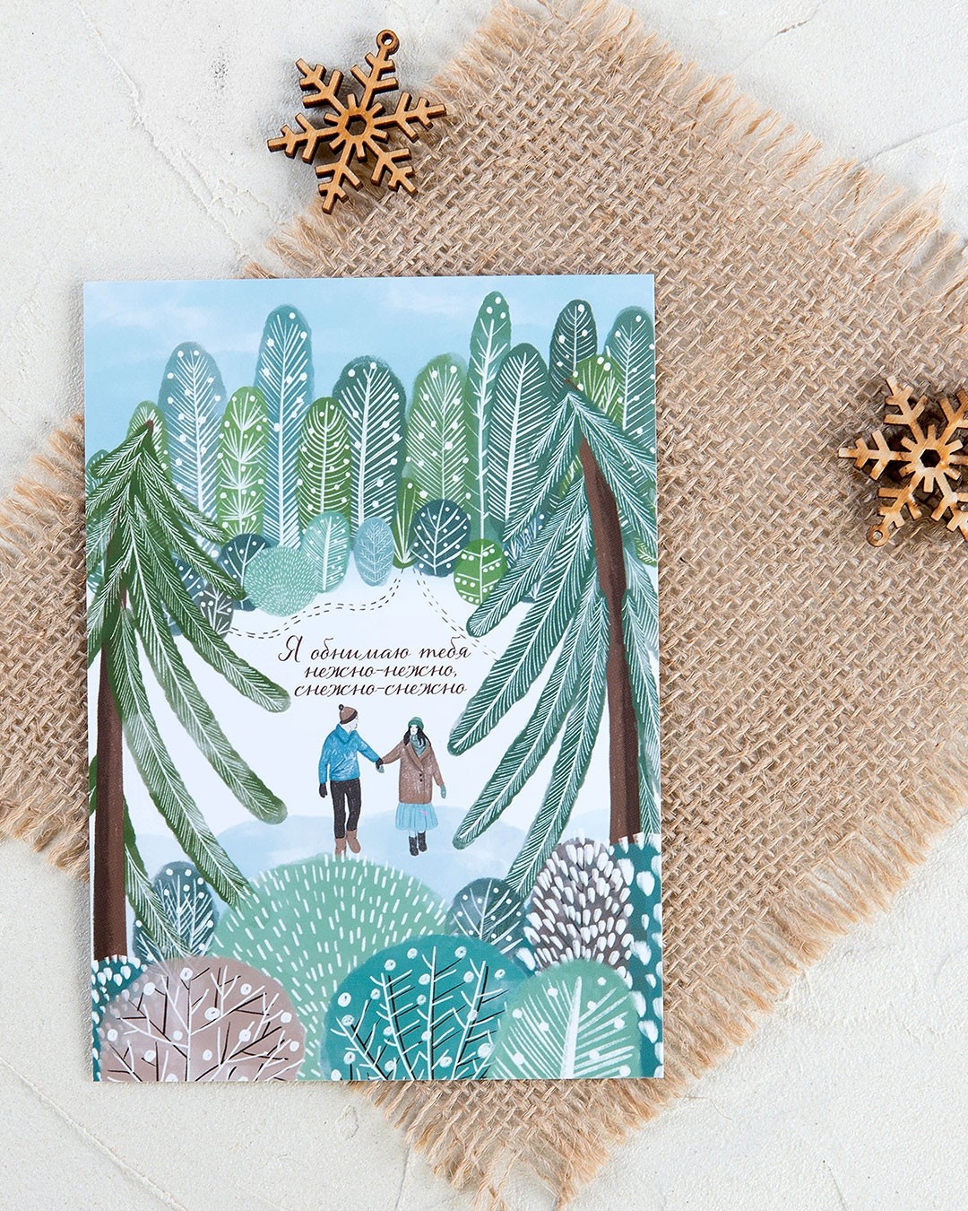 «Я обнимаю тебя нежно-нежно» - слова, которые у многих вертятся на языке. Они воплотились в открытку – нежную, снежную, но наполненную душевным теплом и заботой. Такое поздравление непременно станет радостным и желанным для человека, сердце которого зимой согрето от любви. Трогательная иллюстрация в прохладных тонах зимнего леса контрастирует с теплыми пожеланиями и атмосферой уюта.