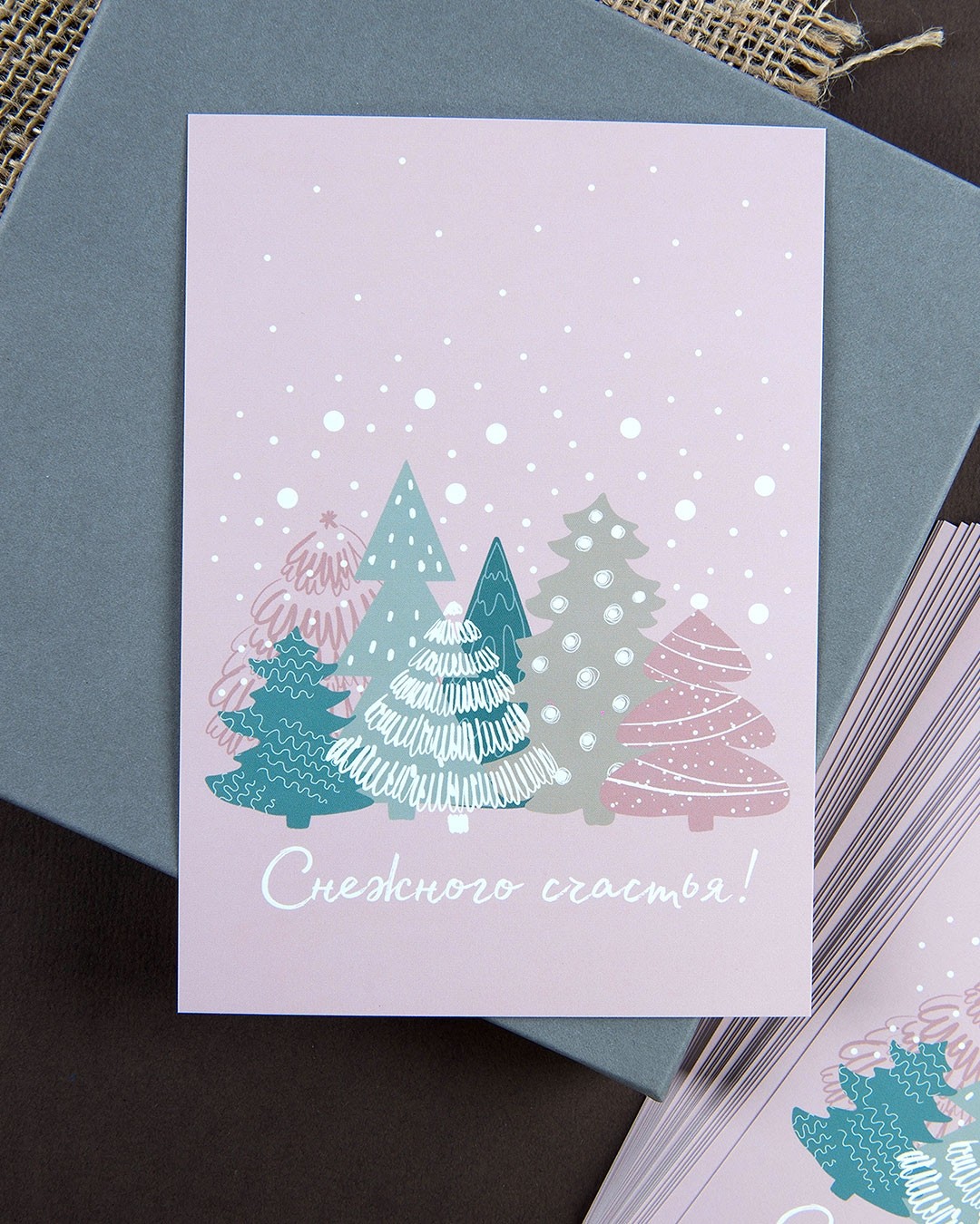 Открытка «Снежного счастья!» выполнена в нежных розовых тонах, перекликающихся по звучанию с пожеланием, написанным на лицевой стороне. Мягкие цвета и силуэты деревьев, будто выведенных пальцем по замерзшему окну, дают ощущение уюта, спокойствия и безмятежности, которое доступно в редкие праздничные дни, когда вся семья собирается вместе за одним столом. Такая открытка станет отличным приложением к букету, подарочной упаковке или праздничному торту на столе, или может стать самостоятельным миниатюрным презентом у любителей обмениваться бумажной почтой.