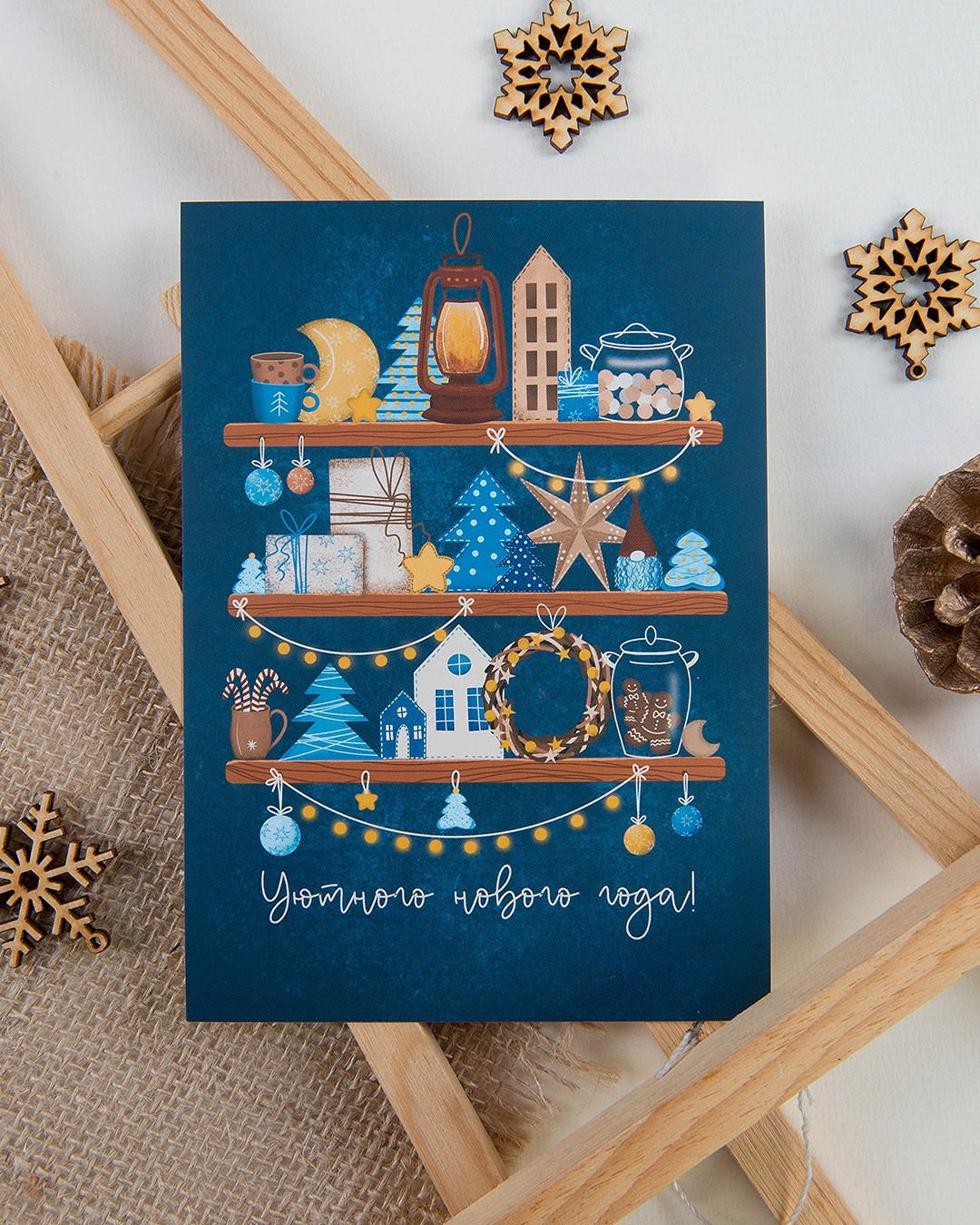 Открытки с пожеланием «Уютного Нового года!» дарят ощущение домашнего праздника в кругу семьи. На фоне спокойного, глубокого синего цвета изображены сувенирные полки, на которых присутствую атрибуты новогоднего праздника, сладости и милые безделушки, настраивающие на уютные посиделки.