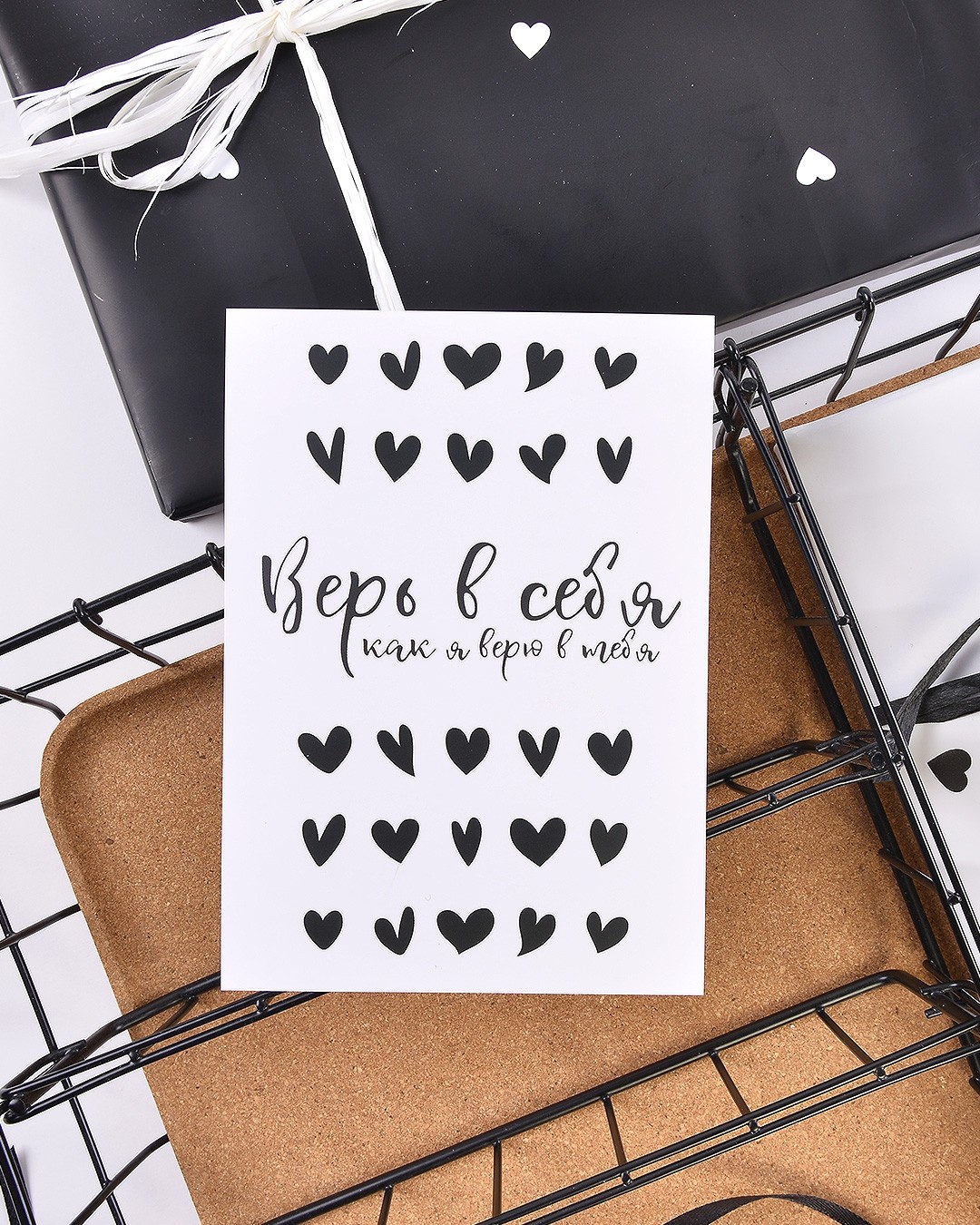 Стильная открытка «Верь в себя» сочетает минималистичный монохром и динамику форм в иллюстрации. Несмотря на цветовое решение, ее невозможно назвать скучной: центральную часть занимает рукописное послание, обрамленное сверху и снизу выстроившимися в ряды сердцами. Каждое сердце имеет индивидуальную форму, как если бы даритель рисовал их собственноручно. Это придает иллюстрации живости, цепляет внимание и оставляет приятные ощущения.