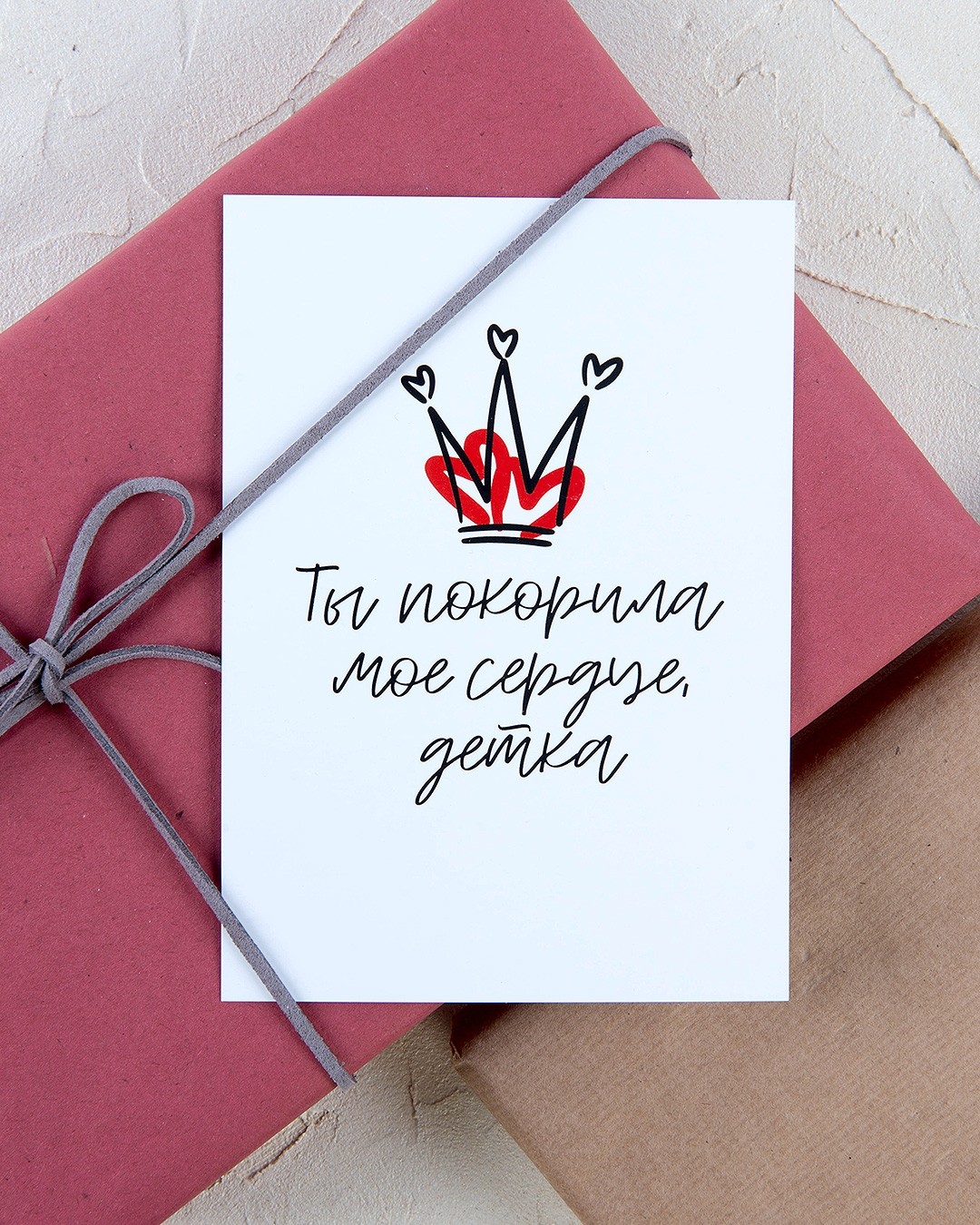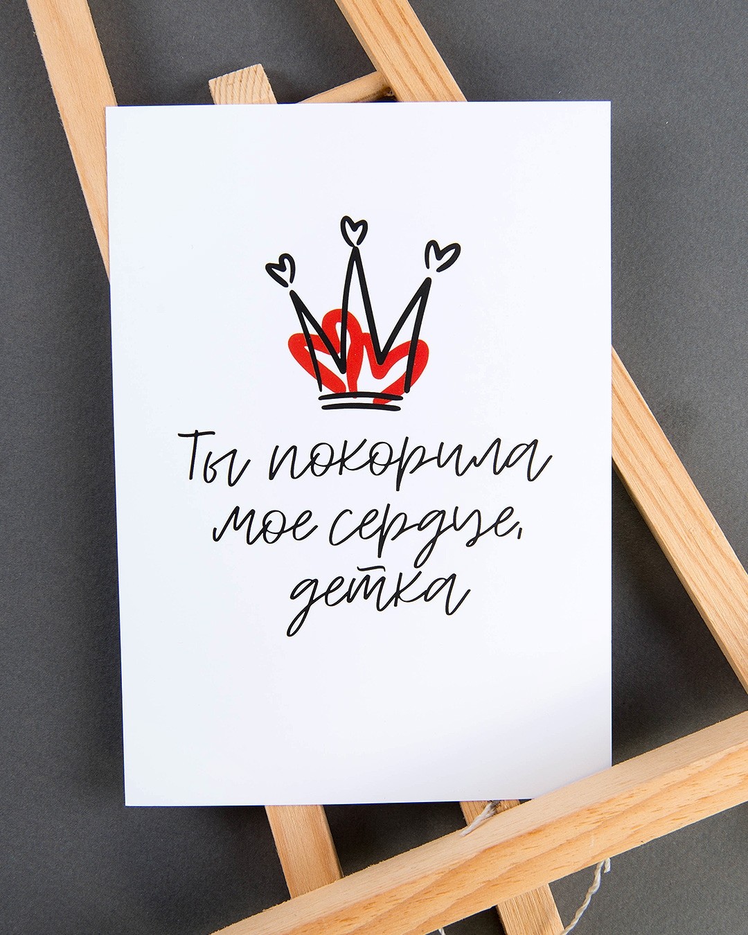 Игривая открытка «Ты покорила мое сердце, детка» посвящена настоящим королевам. Спокойный и слегка небрежный дизайн без излишеств, минималистичный подход к цветовому оформлению и символы влюбленности станут отличным дополнением к подарку для покорительницы сердец.
