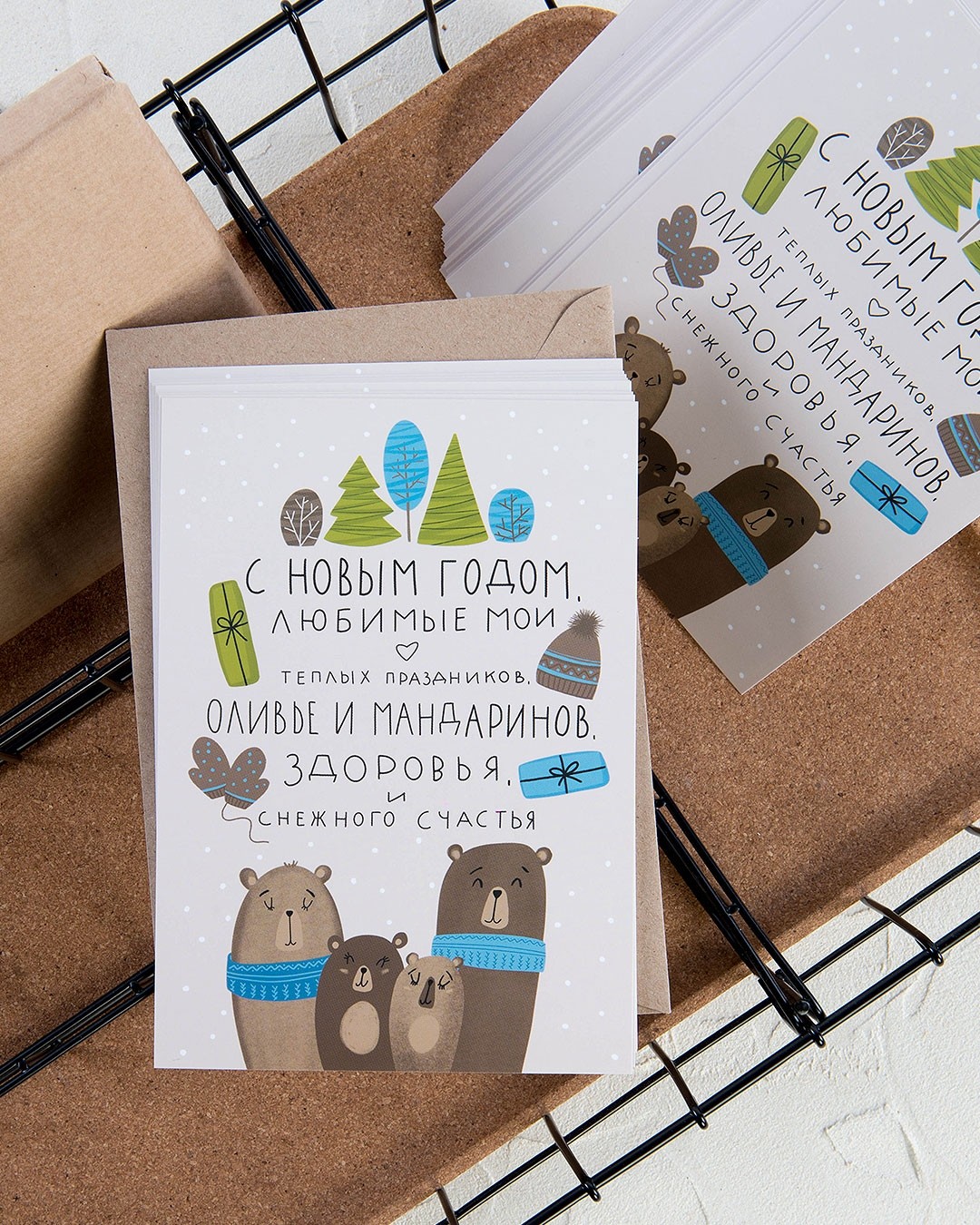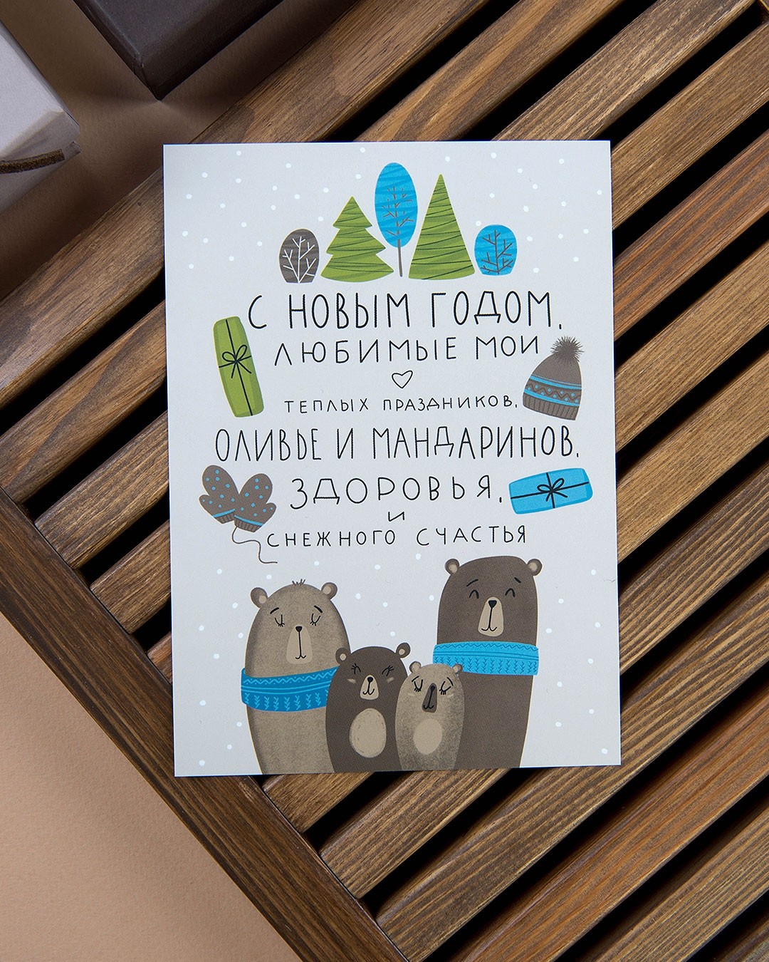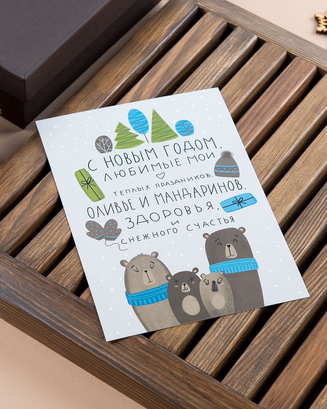 Семья медведей на открытке изображена в милом стиле, в теплых спокойных тонах. Вся композиция вызывает ощущение спокойствия и заботы: на иллюстрации есть узнаваемые спутники зимнего семейного отдыха – варежки, шапка, перевязанные бечевкой подарки для медвежат и силуэты зимнего леса. Яркие цветовые акценты делают открытку нескучной, но при этом сдержанной и приятной.