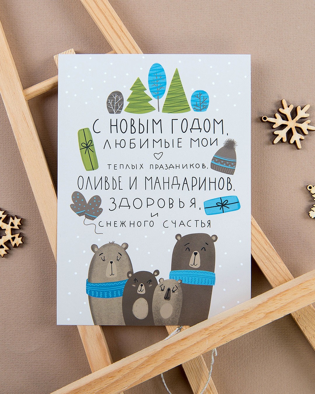 Открытка «С Новым годом, любимые мои» - это квинтэссенция домашнего застолья и праздника в кругу семьи. Это отражено и в знакомых каждому с детства пожеланиях, и в иллюстрации с четырьмя медведями, которыми все мы немного себя ощущаем в праздничные каникулы. Эта открытка предназначена самым близким и дорогим – тем, с которыми мы встречаем Новый год, даже если для этого приходится проехать половину страны.