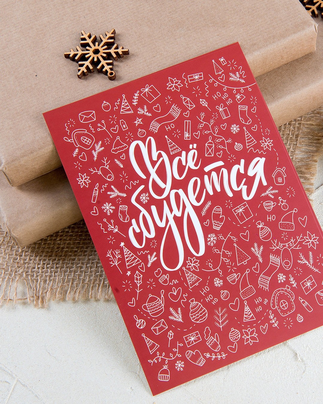 Открытка «Всё сбудется» - обнадеживающее обещание, которое хочется дать всем, кто дорог и близок. Иллюстрация выполнена в праздничном алом цвете, на котором изображены белые контуры разнообразной новогодней атрибутики – шарфы, шапки, ёлки, гирлянды и многое-многое другое. Эту открытку хочется рассматривать и держать в руках, вспоминая самые яркие моменты праздников.