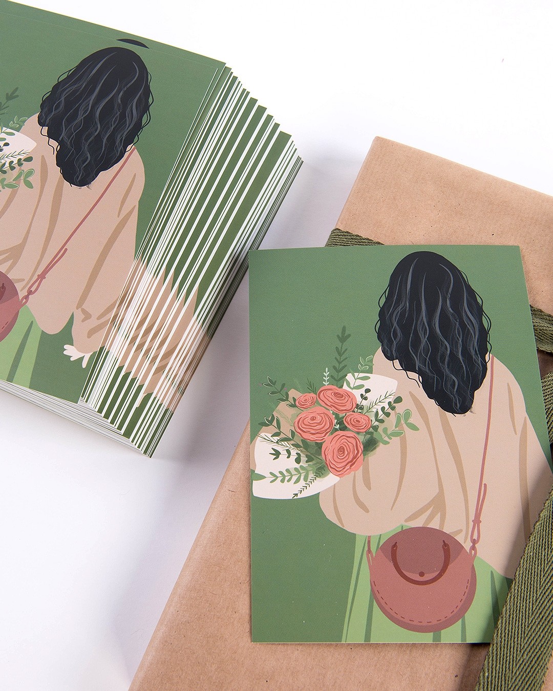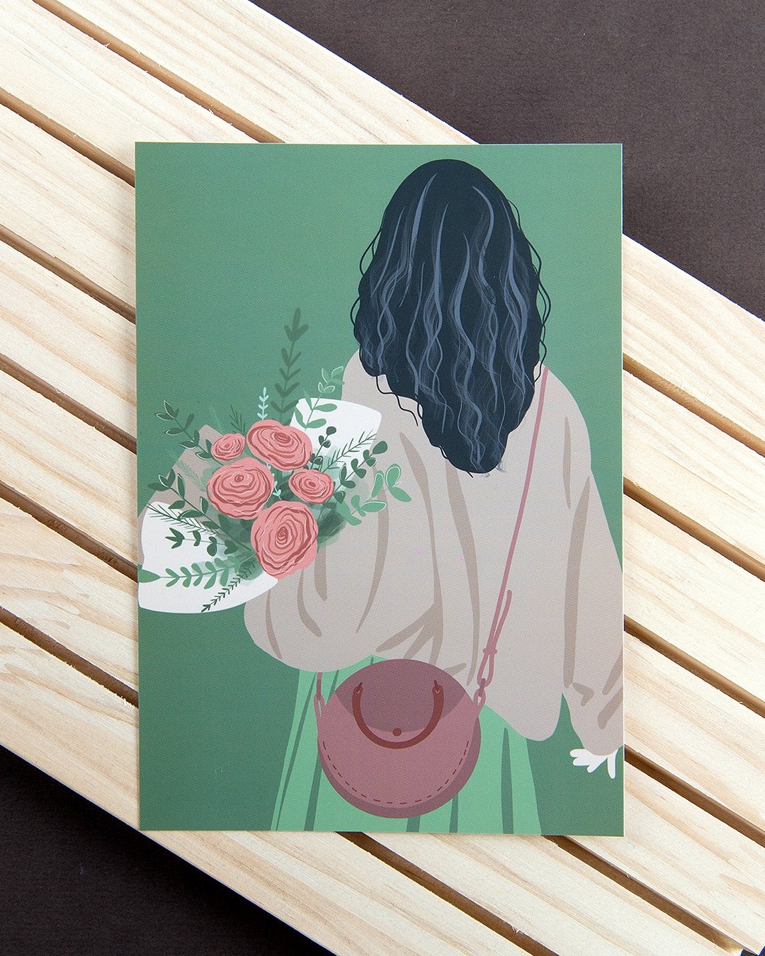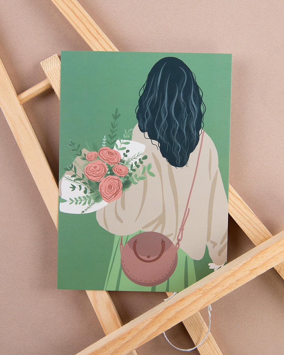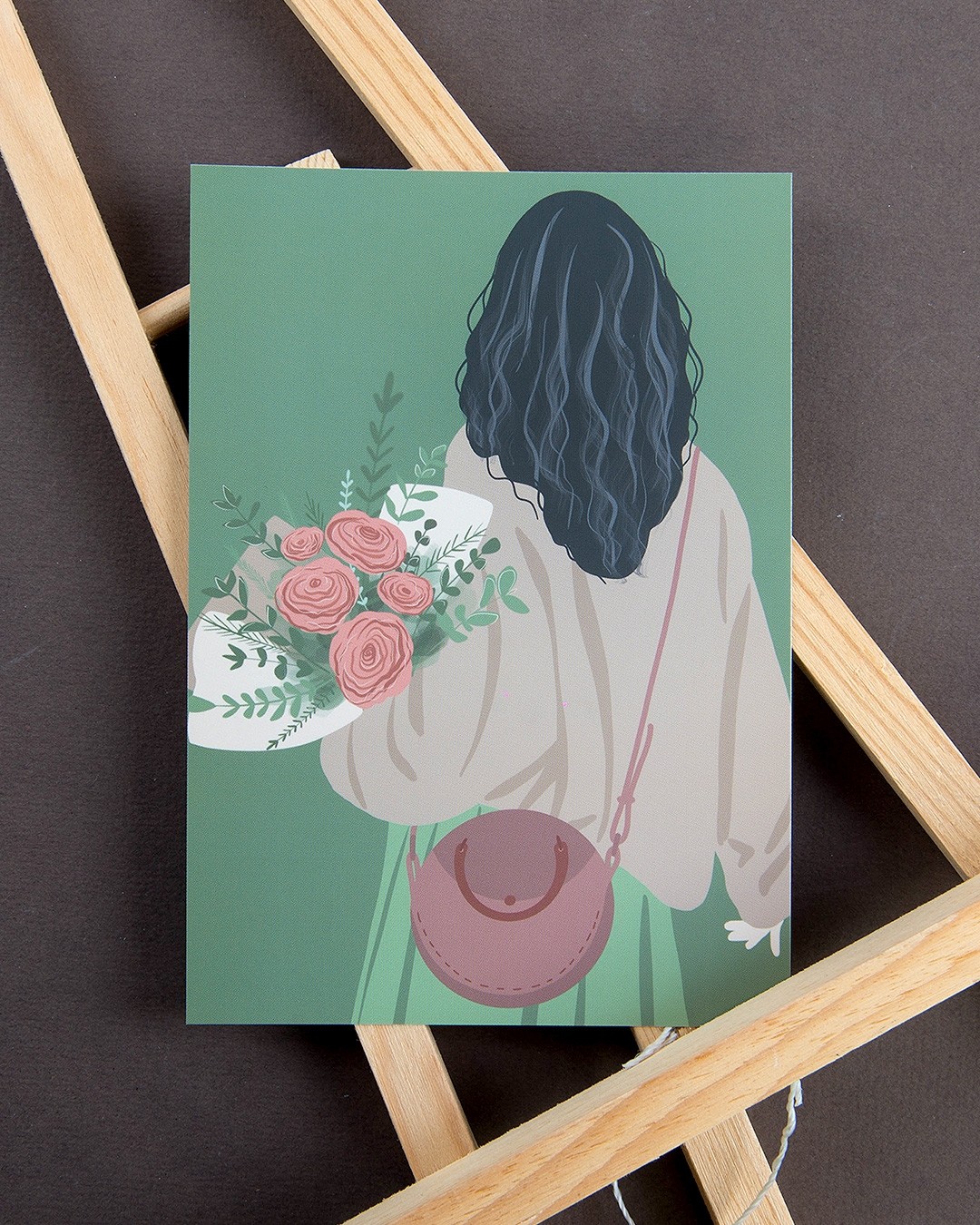 Нежная открытка в цветах весенней зелени «Девушка с цветами» создает настроение легкости и загадки. Плавные линии в сочетании с природными оттенками идеально подходят для весенних праздников.