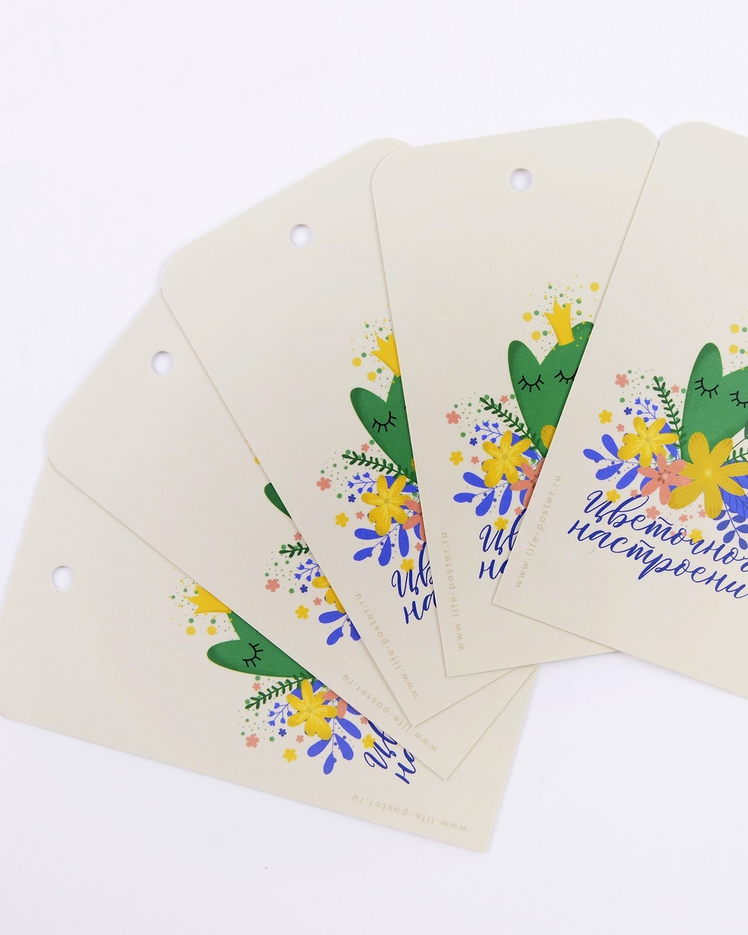 Размер: 5*9 см Материал: мелованная бумага Плотность: 300 г/м2 Отверстие: 4 мм Двусторонняя матовая ламинация Закругление двух углов Набор: 5 шт одного вида